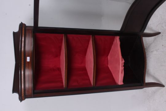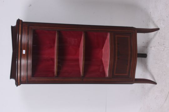 An Edwardian mahogany inlaid bow front upright pedestal corner display cabinet. Raised on square tapered supports having bow glass cabinet with shelved interior. Finished with carved cornice atop. Measures: 162cms x 70cms x 42cms.