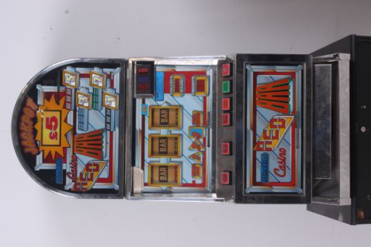 A 1970's £5 jackpot fruit machine gambler, Casino Red Bar. The machine complete with original glass, buttons and base ( see illustration )