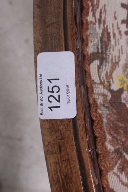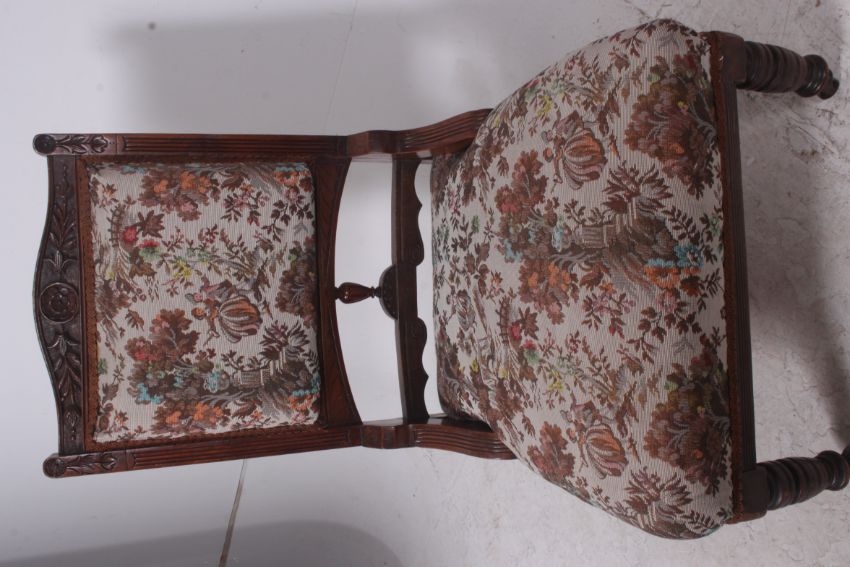 A Victorian mahogany tapestry upholstered ladies armchair / nursing chair. The turned legs with upholstered seat and back rest with carved top rail above. Measures: 97cms x 60cms.