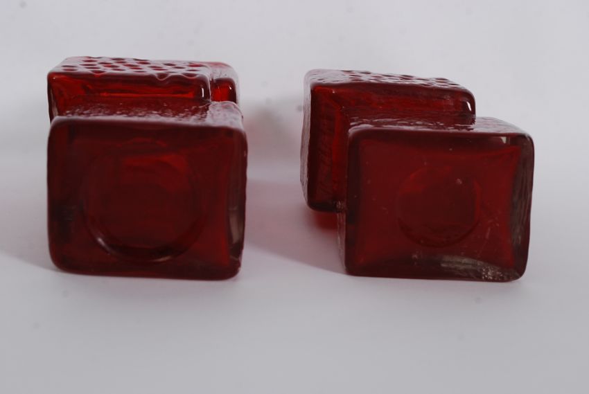 A pair of small drunken bricklayer style vases designed by Geoffrey Baxter for Whitefriars Glass, finished in Ruby Red colour, shape no 9673 produced between 1969-74, height 21cm.