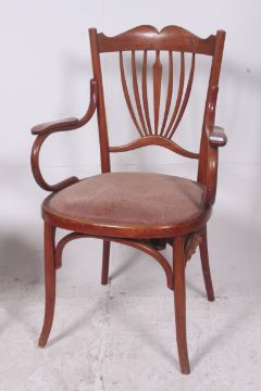 2 1930's rare shaped Thonet bentwood cafe armchairs / chairs raised on turned legs with upper peripheral stretchers having upholstered panel seats with pierced Art Nouveau back rests and gallery arms. Measures: 95cms x 61cms x 52cms.