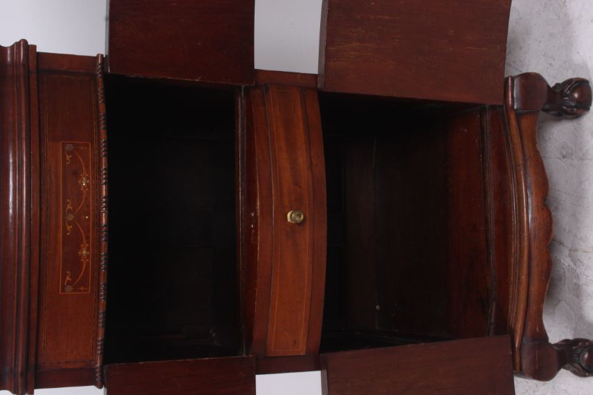 A 1900's Edwardian mahogany inlaid bow front gramaphone cabinet. The hinged top with cupboards beneath, all inlaid detailing. Raised on ball and claw feet with cabriole legs. Measures: 110cms x 50cms x 54cms.