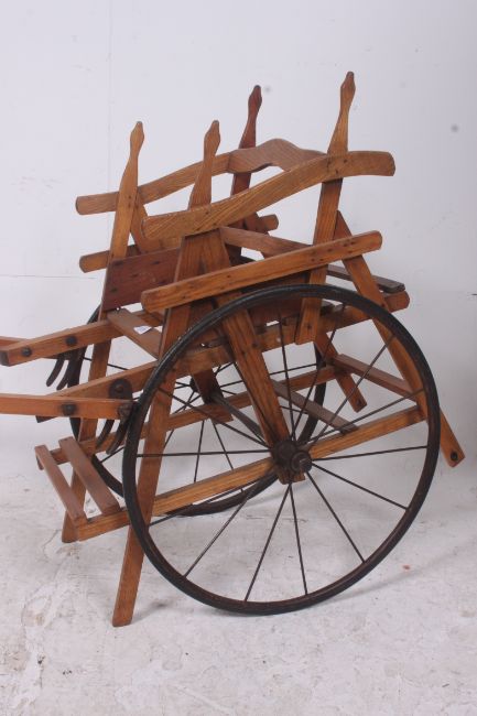 A 19th century French childs dog cart / trap. The large wheels having shaped and slatted seat with arms facing forward. Measures: 80cms x 135cms x 42cms.