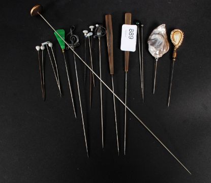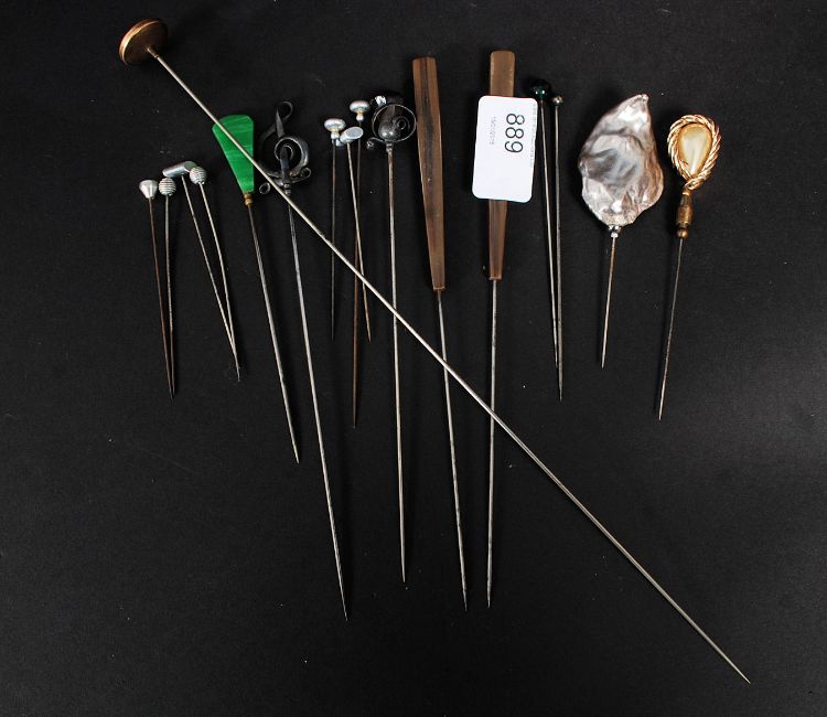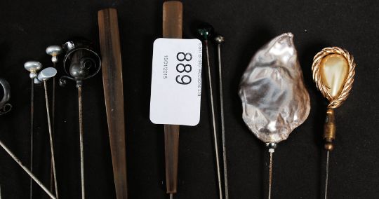 A collection of hat pins to include oversized mother of pearl example, Victorian rapier with paste stone, Jade and others etc