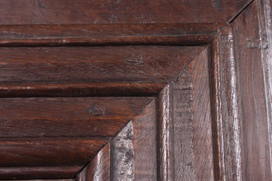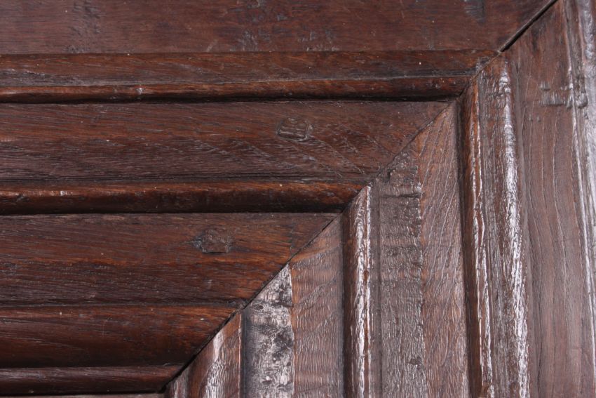 An 18th century carved oak Breton wardrobe armoire. Of immensely thick oak construction with carved geometric panelled doors and body having flared cornice atop