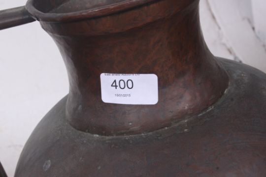 A large 19th century French copper ewer having bulbous body with twin handles. Together with a large copper twin handle lozenge shaped pan and another large bulbous copper pan