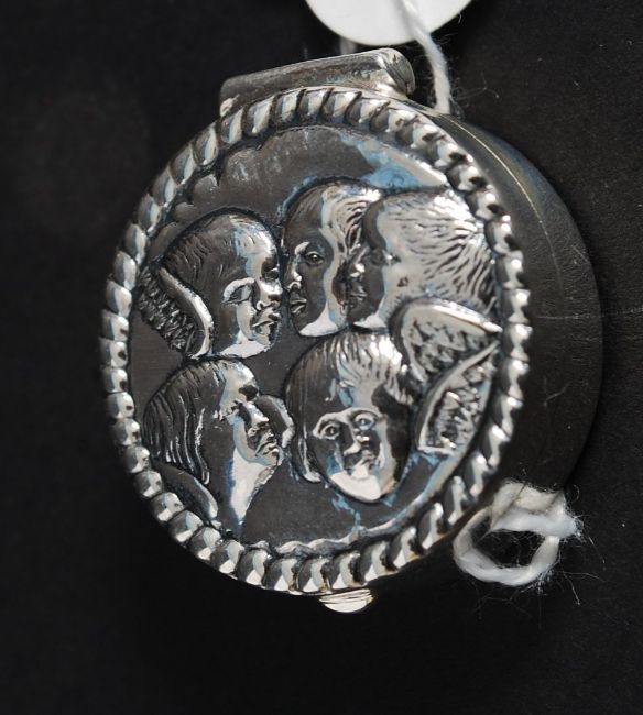 A white metal ( 925 silver ) pill box with embossed cherubs to the lid
