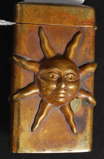 A 20th century brass vesta case depicting the sun to front. Opening to top.