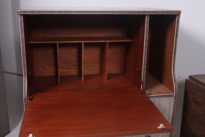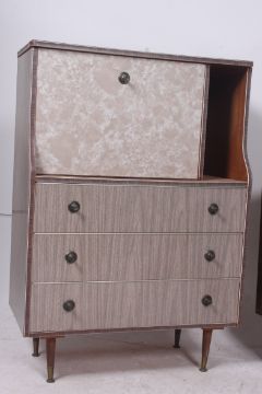 A 1950's bureau desk having unusual grey laminated finish having 3 drawers with brass handles. Together with a 1950's walnut laminate effect drop leaf dining table
