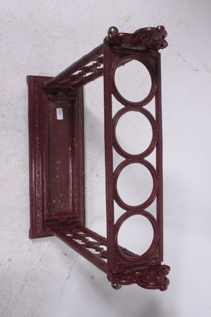A Victorian style cast iron ochre red painted umbrella stick stand in the coalbrookedale style with trays to base Measures: 64cms x 53cms x 19cms.