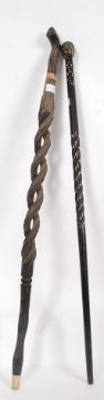 2 carved African tribal walking sticks, one with barleytwist design with Carved top together with a ebony and bone inlaid walking stick with brass deity to the top. Measures 94cms high largest