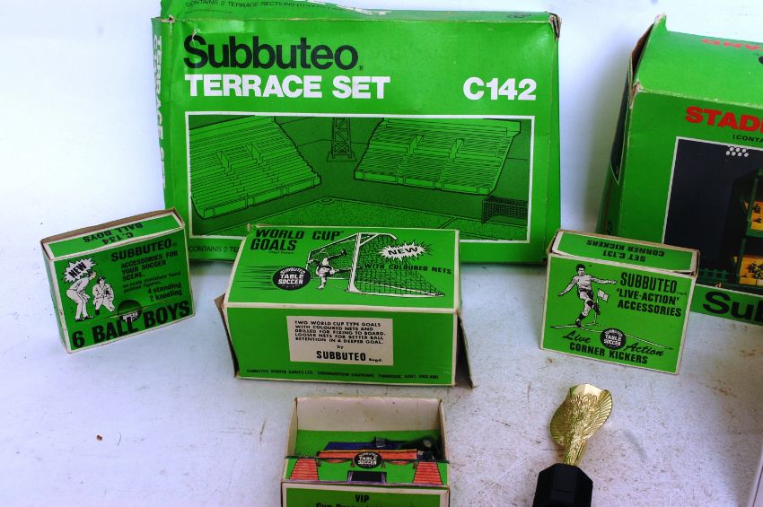 SUBBUTEO; A collection of original vintage Subbuteo accessories - most still boxed to include Grandstand etc, along with assorted loose figures etc,