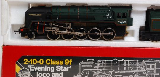 HORNBY: An original Hornby railway trainset 00 Gauge R065 Evening Star locomotive in original box. NOTE: This lot comes from an extensive collection of vintage railway trainset items ranging from Hornby, Wrenn, Roco and Airfix. All items are generally presented in good original condition, many being unused or with light use. Stored carefully away for many years by the gentleman collector, and all items (unless stated) come in original boxes, with paperwork / instructions where necessary. Buyers are reminded to satisfy themselves on condition of specific lots, but in general item from this collection are in good to excellent condition.