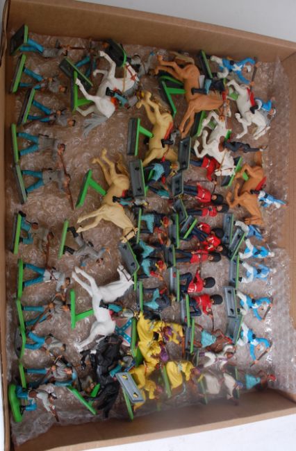 BRITAINS; A collection of vintage Britains Deetail plastic metal mounted figures to include Cowboys, Coldstream Guards and others. 40+