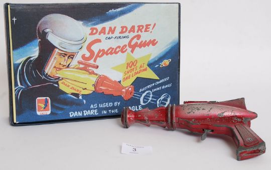 An original 1950's Lone Star Dan Dare Space Gun in red colouring. Complete is a reproduction box.