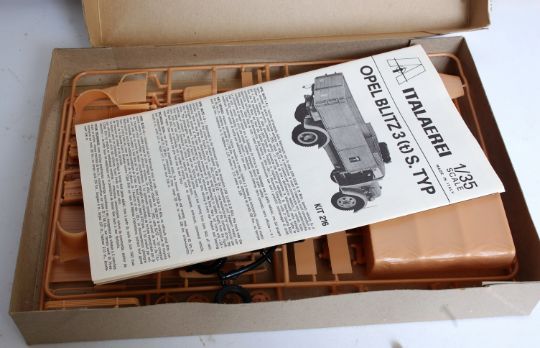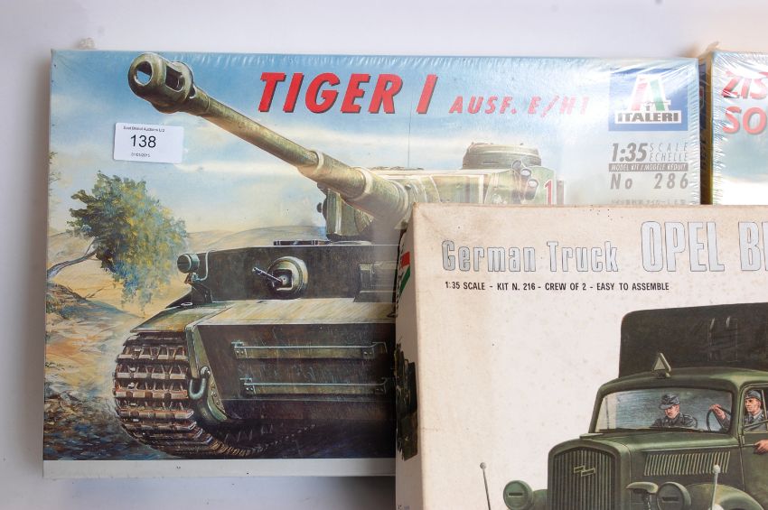 MODEL KITS: 3x 1:35 scale military model kits, including German truck, Soviet truck and Tiger tank. Each by Italaleri. Unmade