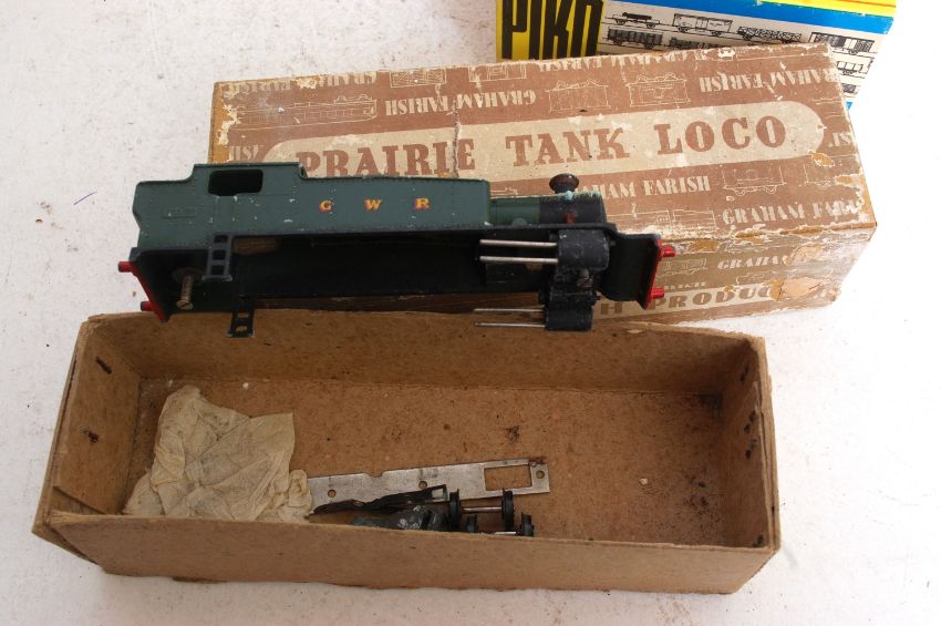 TRAINS; A collection of three assorted vintage railway trainset items to include a Graham Farish Prairie Tank Loco body in original box, Piko 12218 loco and 4x vintage Piko carriages. NOTE: This lot comes from an extensive collection of vintage railway trainset items ranging from Hornby, Wrenn, Roco and Airfix. All items are generally presented in good original condition, many being unused or with light use. Stored carefully away for many years by the gentleman collector, and all items (unless stated) come in original boxes, with paperwork / instructions where necessary. Buyers are reminded to satisfy themselves on condition of specific lots, but in general item from this collection are in good to excellent condition.
