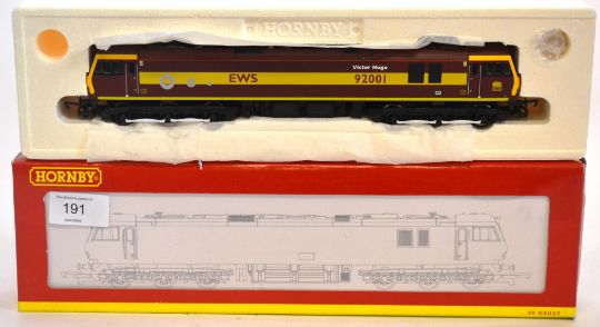 HORNBY: An original Hornby 00 Gauge Class 92 loco Victor Hugo R2354A. In original box with paperwork. Notes: this lot comes from an extensive private collection of model railways trainset locomotives and accessories (Hornby, Bachmann, Mainline etc). The newer pieces are mostly unused and will come with all paperwork, interior packaging and accessories. The gentleman vendor had one set to use, and one set to keep. Some older models are 'used' but in original packaging / boxes. Buyers are reminded to satisfy themselves on the condition of each individual lot, but the majority of this collection is 'as new.'