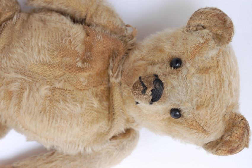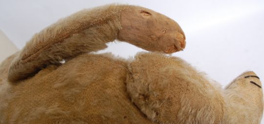 AN ANTIQUE c1900 believed Steiff teddy bear. Heavy pronounced snout, woodwool stuffing and original black glass eyes. Jointed limbs and sewn ears. Provenance; Belonging to the same family since 1938, 'Norbet' as he is known was acquired in 1938 from a Farmers' daughter in Brislington who had Norbert since childhood.