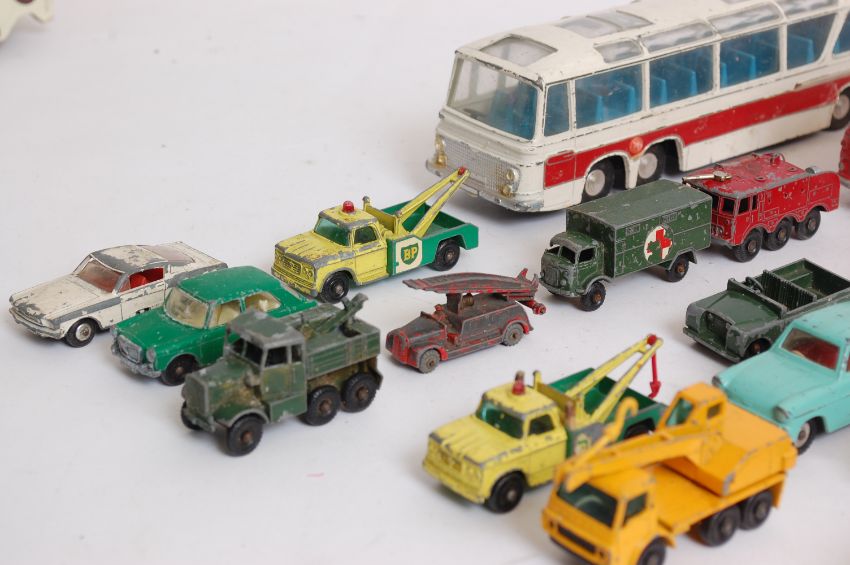 DIECAST; A good selection of vintage Corgi & Dinky loose diecast; comprising of; Dinky Cadillac Rescuer, 952 Coach, Dinky 155, Corgi Comics Basil Brush, Corgi Jeep FC150, Dinky Land Rover, Simon Snorkel fire engine etc along with a quantity of vintage Lesney diecast model vehicles / cars etc.