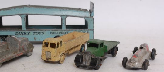 DINKY; A collection of 7x vintage Dinky diecast model vehicles to include Transporter, 2x racing cars, flatbeds, trucks etc. See illustration