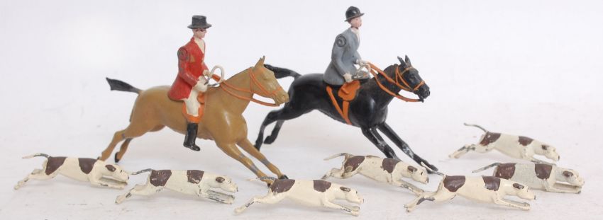 BRITAINS; A rare Britains lead hunting set, comprising of two riders, 7x dogs and the little fox. The riders with moving arms.