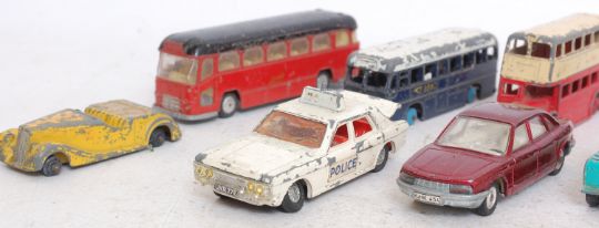 DIECAST; A collection of 10x vintage Dinky and Corgi diecast models to include 3x buses, 283, Land Rover, Zodiac Police Car and others etc.