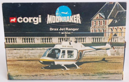 CORGI JAMES BOND; An original Corgi 007 Moonraker 930 Drax Jet Ranger, in original box. Appears unused, with original band still holding helicopter in box, missiles unpressed.