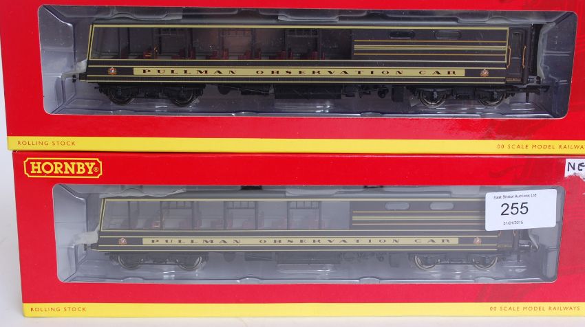 HORNBY:Two original Hornby 00 Gauge Pullman Observation Cars R4437. In original boxes. Notes: this lot comes from an extensive private collection of model railways trainset locomotives and accessories (Hornby, Bachmann, Mainline etc). The newer pieces are mostly unused and will come with all paperwork, interior packaging and accessories. The gentleman vendor had one set to use, and one set to keep. Some older models are 'used' but in original packaging / boxes. Buyers are reminded to satisfy themselves on the condition of each individual lot, but the majority of this collection is 'as new.'