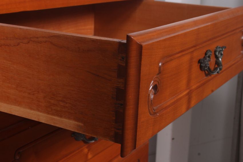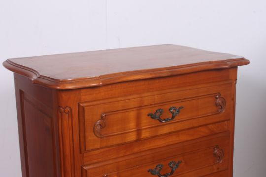 A French fruitwood upright chest of drawers being raised on shaped supports having a detailed bank of drawers with original handles and flared top above