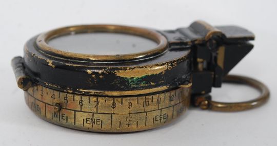 An Australian world war 2 military metal and brass cased navigators prismatic compass in leather pouch embossed Butler Bros Greek Street Brisbane