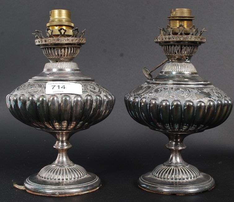 A pair of 19th century silver plate oil lamps having chase decorated detailing being converted to electricity