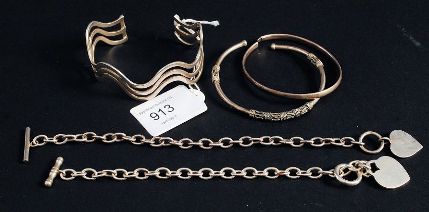 A collection of 5x white metal / silver items to include bracelets, bangles etc.