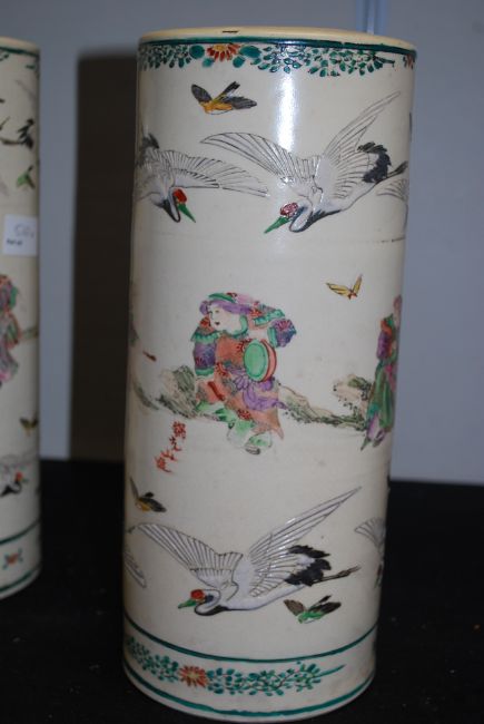 A pair of 19th century Chinese oriental hand painted cylindrical vases. Painted scenes depicting treetop happenings, painted in raised form with birds. 31cm tall.