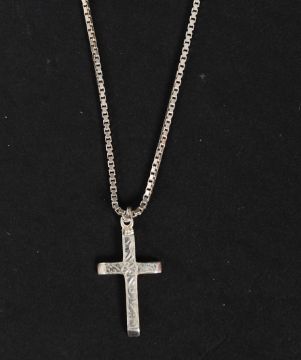 A ladies silver 925 crucifix and chain. THe crucifix being chase decorated. Weight 5.4g