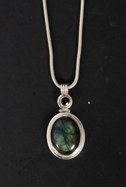 A ladies silver 925 and labradorite pendant and chain. The cabochon cut stone set to oval mount. 39.5gw