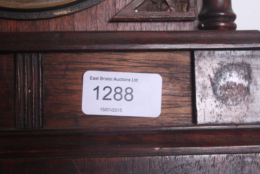 An Edwardian oak cased brass and enamel faced mantel clock. The gingerbread style case with 8 day brass movement set within