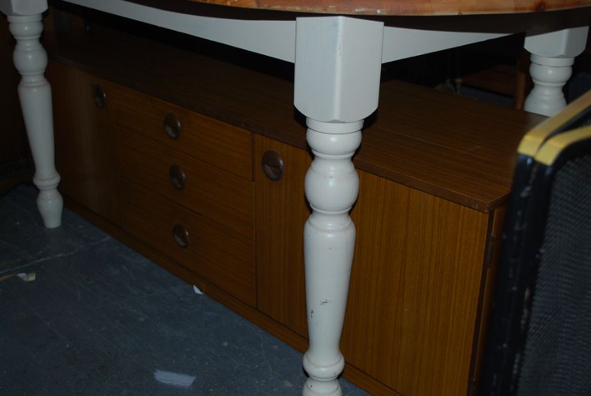 A vintage Schreiber low sideboard having opening cupboard doors flanking three drawers to centre