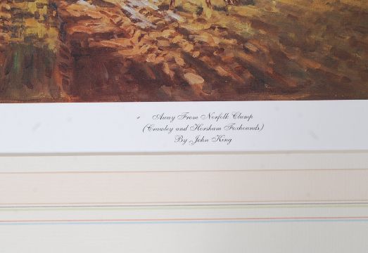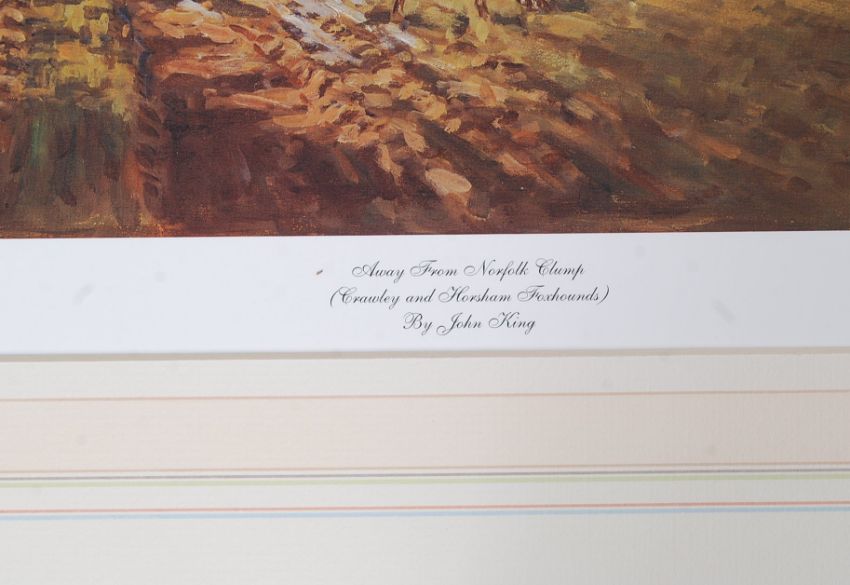 After John King. Mounted print signed by the artist to the margin. The print entitled to the mount ' Away From Norfolk Clump ' Crawley & Horsham Foxhounds. No 234 / 250