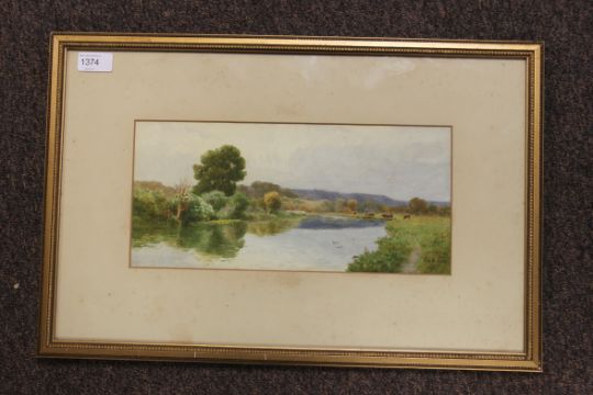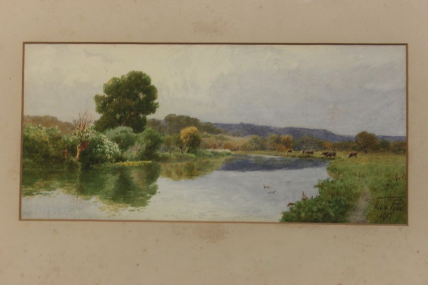 Thomas Pyne (British, 1843–1935) Edwardian watercolour painting of the river at Dedham, Essex. Signed by the artist and dated to corner. Notation to verso. Measures 15cms x 34cms wide being framed and glazed