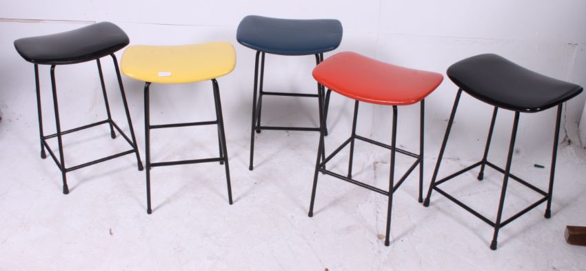 Five vintage retro vinyl topped tubular metal stools, each in a different colour, comprising of a pair of black topped and three other coloured stools.