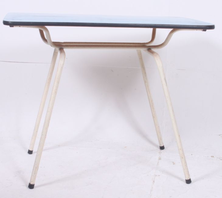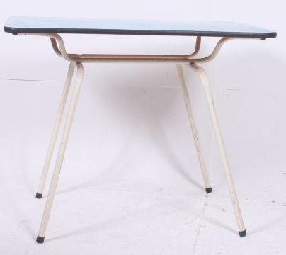 A retro tubular metal and formica dining kitchen table with white painted metal frame, bule formica top. H73cm x W90cm x D59cm