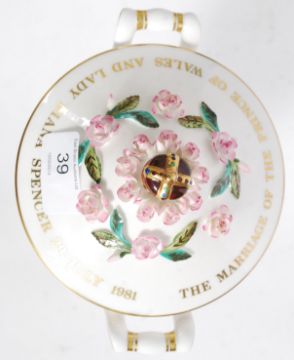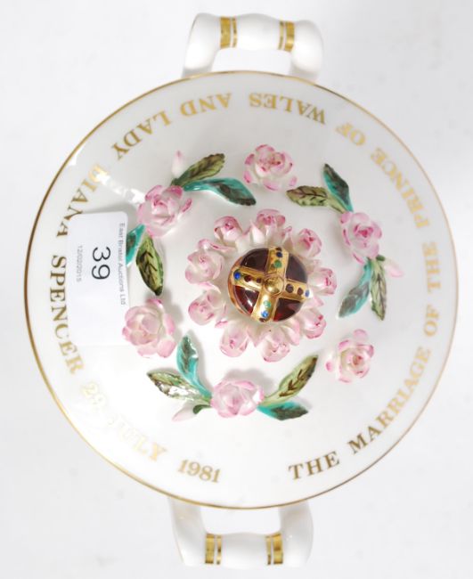 A Coalport commemorative floral encrusted vase to commemorate the wedding of Prince Charles to Lady Diana Spencer, 1981, the base with transfer mark stating limited edition of two hundred and fifty pieces, piece no. 28 standing 20 cm tall.
