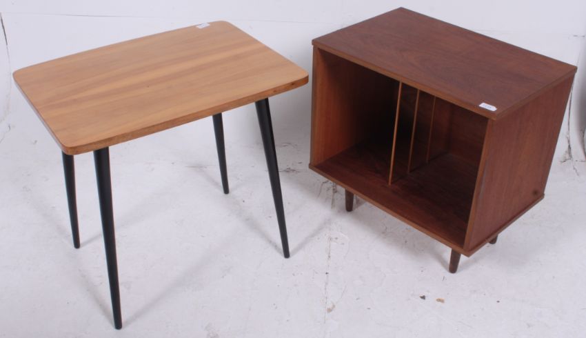 A retro 1970's Danish teak wood record cabinet of square form being raised on tapered supports. H57cm x W61cm x D46cm