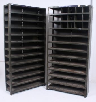 A pair of original mid 20th century Industrial large green enamel metal sectional cubby cabinet. The cabinets each having multiple shelves some with section dividers. Each cubby section having painted notation no's etc to sides. Ex Douglas motorcycle Factory. H190cm x W92cm x D31cm