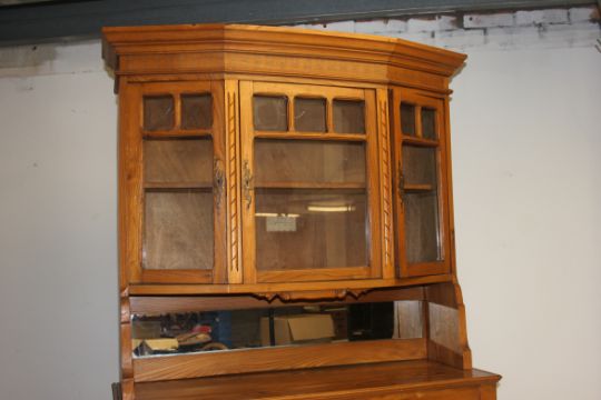 A 1970's French made oak buffet comprising glazed portion to top and cupboard section to base, two drawers over two opening doors standing on square feet. 209 x 101 x 40