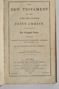 1828 leather bound bible ' Thew Testament of our Lord & Saviour Jesus Christ translated out of Greek and with the former translations diligently compared and revised by his Majestys Special Command. Together with others