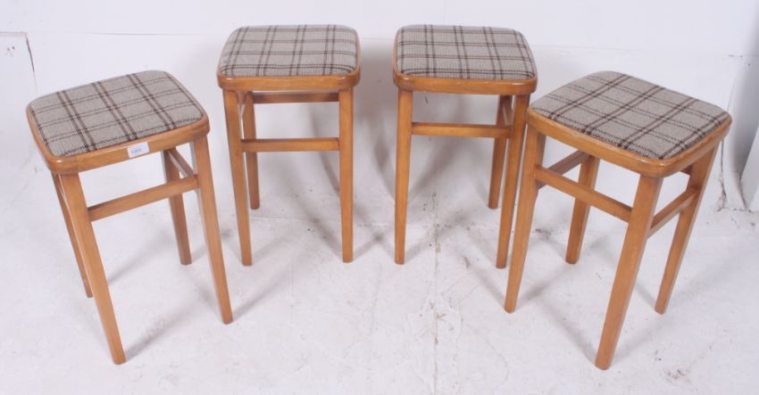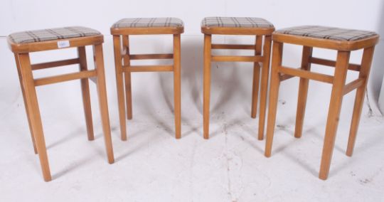 A set of 4 1950's beechwood and pad upholstered dinette / diner kitchen stools raised on squared supports. H52cm x W33cm x D33cm