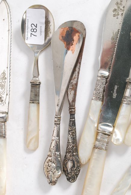 Victorian mother of pearl handled cake knives, two silver handled shoe horns, pickle fork and jam spoons.