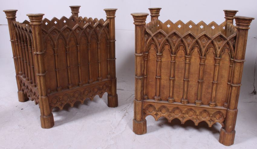 A good pair of 20th century oak style eclesiastical / Arts & Crafts planters. Raised on octagonal feet having gothic window stylised panels with finial corners. 63x54x54cm